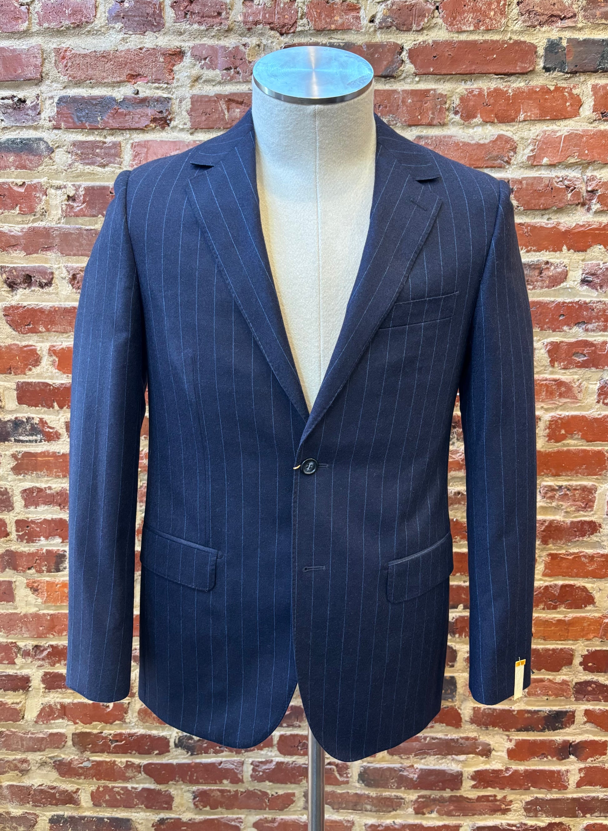 Navy blue suit with light blue stripes